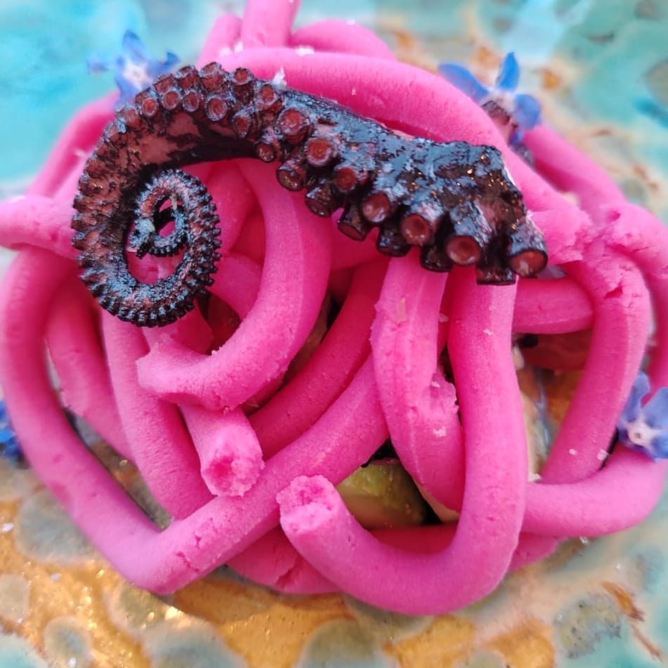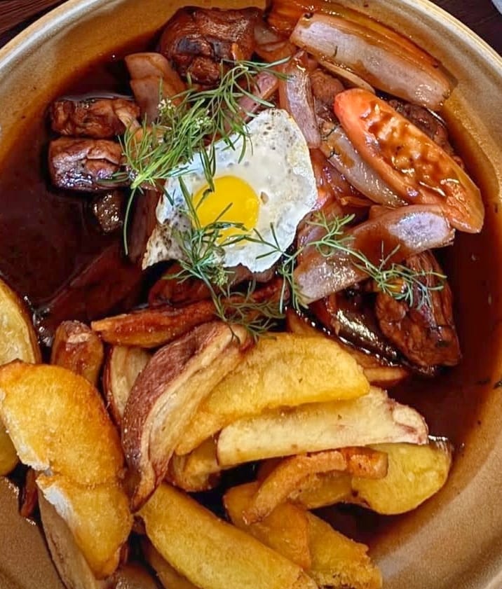 Comenzamos la experiencia probando una causa andina, pulpo brasa. tomate cherry, alioli ahumado. Plato de fondo lomo saltado con papas fritas, arroz con choclo y alpaca. Acompañado de cancha chulpi, papas nativas ají de rocoto y huacatay. Para el postre, nos ofrecieron lúcuma de oro, melcocha de pecanas, mouse y helado de lúcuma, acompañado de cervezas cusqueña dorada y malta